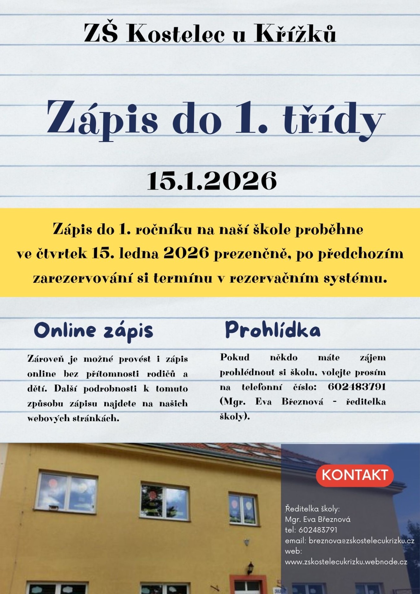zápis do prvních tříd se uskuteční v čtvrtek 15.01.2026 od 13.00 do 17.00 hod.